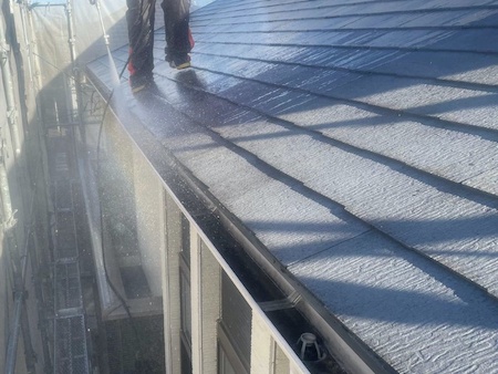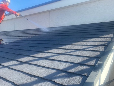 屋根の高圧洗浄です。高圧洗浄とは、業務用の高圧洗浄機を使用して付着している汚れや古い塗膜などを除去する作業です。