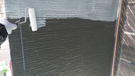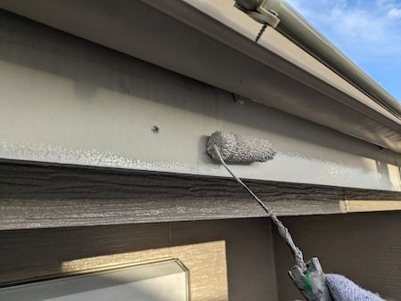 下塗りです。外壁に上塗り材の吸い込みを防ぎ、塗料を定着させます。色ムラや塗膜の剥がれ等がないように施工します。