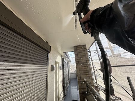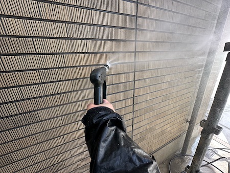 次に高圧洗浄機で洗い流します。汚れが落としきれてないと、どんなに丁寧に塗っても剥がれる等の不具合が出てしまいます。