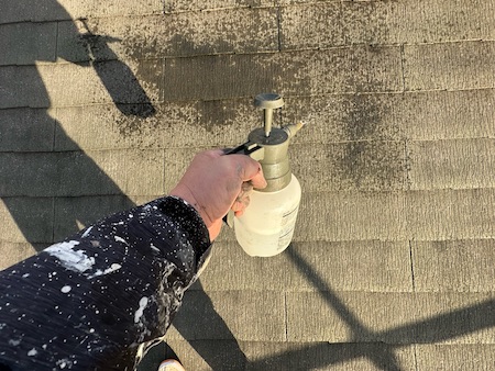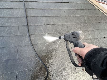 高圧洗浄する前に、水洗いでは落ちにくい汚れは洗浄剤を使用して落とします。屋根に洗浄剤を噴射しているところです。