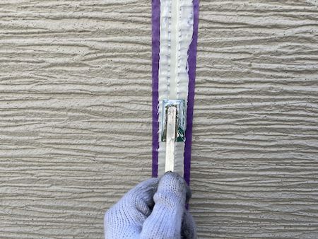 シーリングを撤去したら、きれいに仕上げるために目地にそってテープを貼り、接着剤の役目を持つプライマーを塗布します。