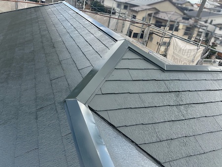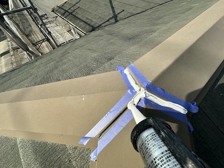 棟板金が合流する三又部分にコーキング材を充填しています。つなぎ目をしっかりと埋めて、雨水の侵入を防ぎます。