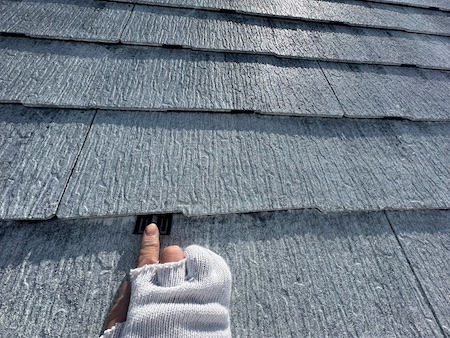 下塗り後、タスペーサーを一枚一枚、差し込みます。屋根と屋根の間に隙間をつくり、雨漏りや結露防止の役目があります。