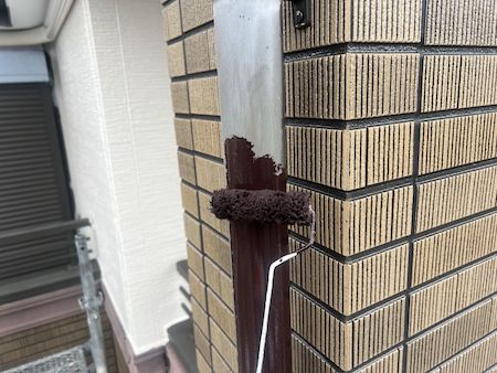 縦に設置された樋も高耐久のフッ素塗料でチョコレート色に塗り替えていきます。