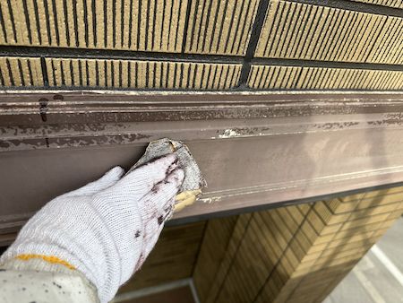 紫外線や風雨の影響で、塗膜のハガレや色あせが目立っている幕板の下地処理です。