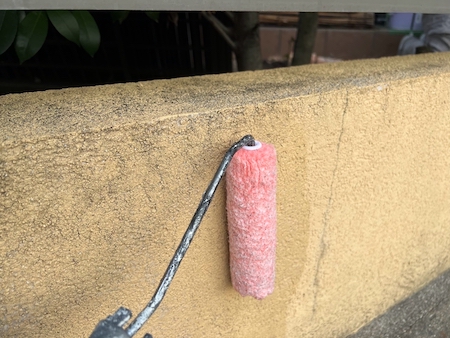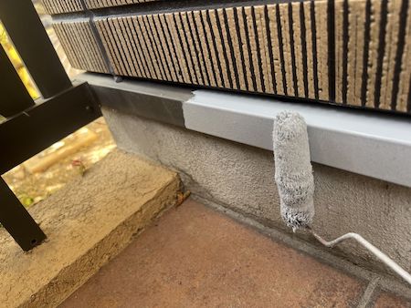 雨だれ跡や汚れが目立っている擁壁も塗装していきます。下塗りからです。
