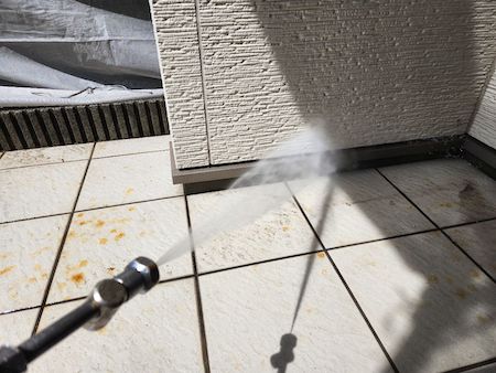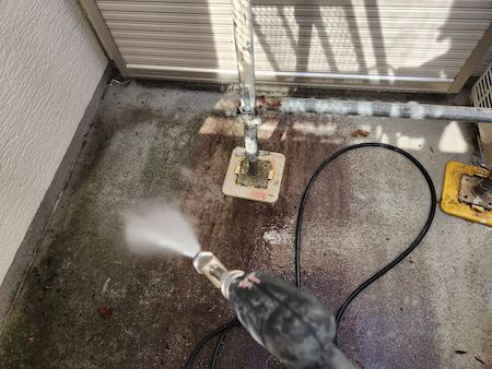 ベランダ床は、土ぼこりも溜まりやすく黒く汚れていることが多い場所です。すみずみまで念入りに高圧洗浄していきます。