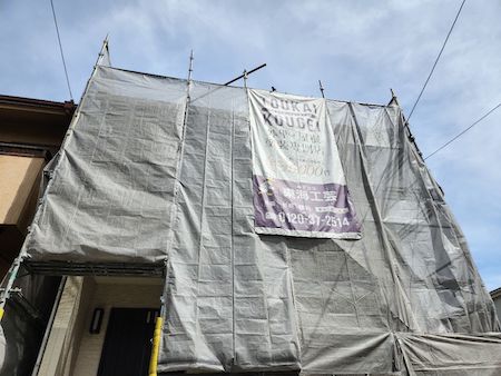 近隣挨拶を行って工事着工となります。足場を組み、洗浄水や塗料が飛散しないようにメッシュシートで建物全体を覆います。