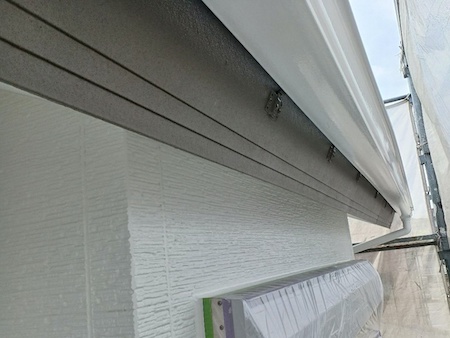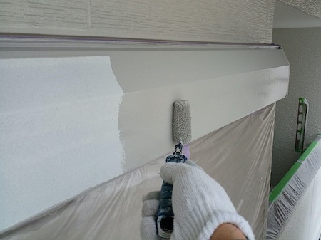 外壁の上下で塗料の色を変えてツートンカラーに塗り分けます。白い部分が下塗り完了した箇所です。次に中塗りします。