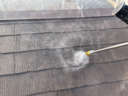 業務用の高圧洗浄機から水を噴射させ、その圧力によって屋根に付着している砂ぼこりや古い塗膜などの汚れを除去します。