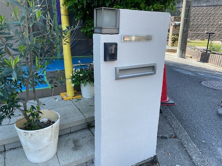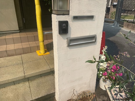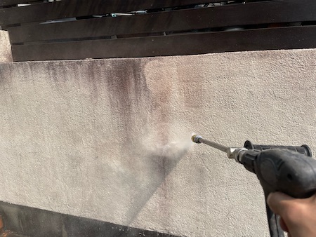 擁壁の洗浄です。雨だれ跡や染みついた黒ずみ汚れを落とします。お家まわりの長年の汚れを徹底的に洗い上げていきます。