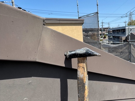 釘の浮きを打ち直します。浮きを放置しておくと、隙間から雨水の侵入や、板金の固定が低下してしまう危険性があります。