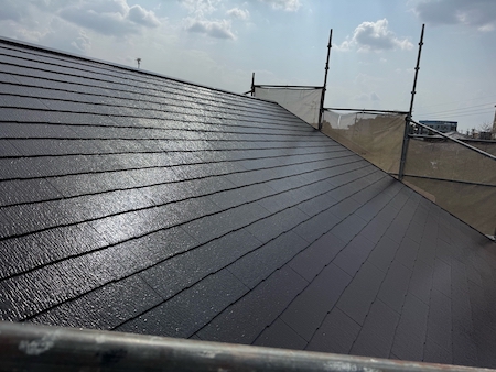 色あせていたスレート屋根が塗装によって光沢を取り戻し、表面のキメも整ったことで、見違えるほど美しくなりましたね。