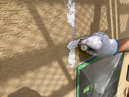 外壁のひび割れに沿ってシーリングを充填していきます。