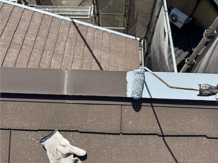 屋根鈑金の塗装です。サビが出ると長持ちしないので腐食を防ぎ、密着度を高める塗料を下塗りしていきます。