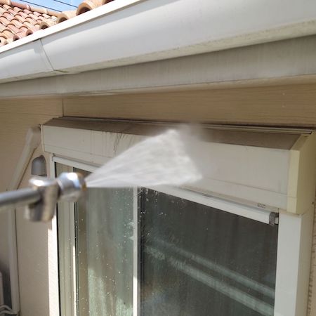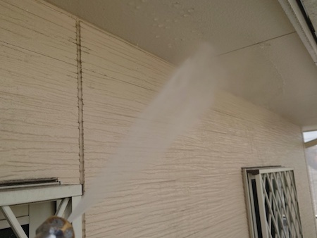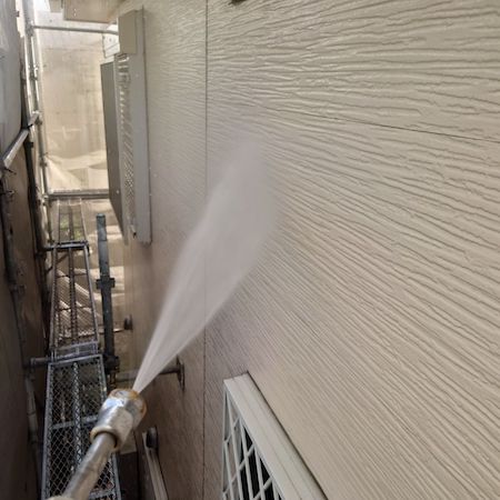 業務用の高圧洗浄機から水を噴射させ、その圧力によって、表面に付着したホコリや古い塗膜などの汚れを除去していきます。