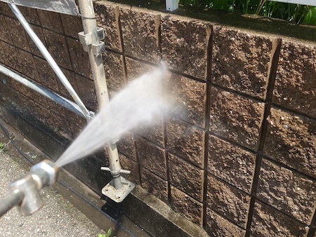 擁壁や土間など塗塗装しない箇所も含め、外構まわりも洗浄します。擁壁の凹み部分に付着した汚れも丁寧に落とします。