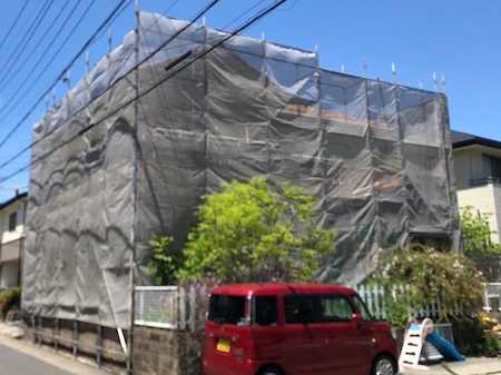 近隣挨拶を行って工事着工となります。足場を組み、洗浄水や塗料が飛散しないようにメッシュシートで建物全体を覆います。