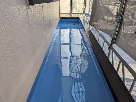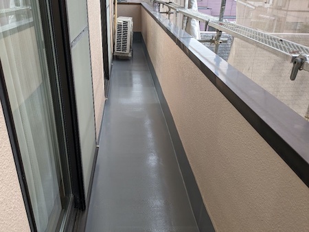 ベランダのウレタン防水工事完了です。定期的にトップコートを塗り替えると防水層が長持ちします。