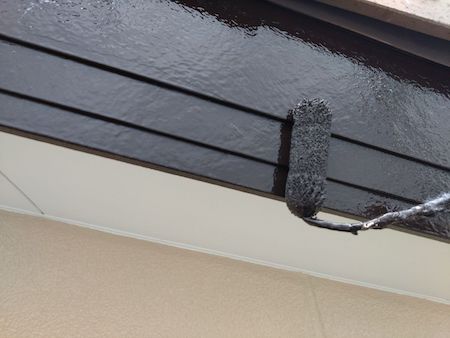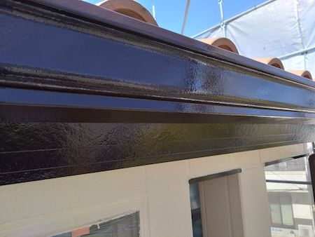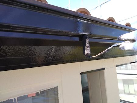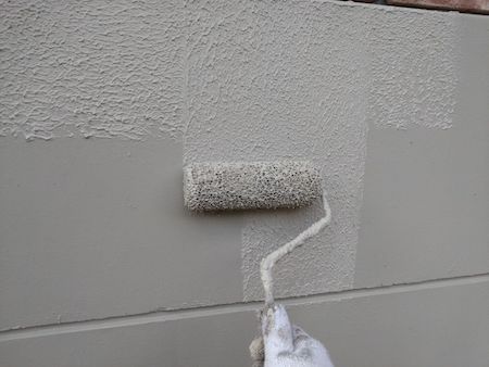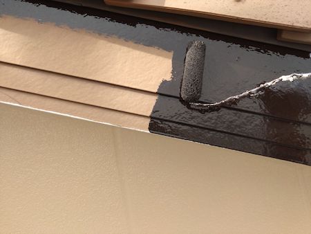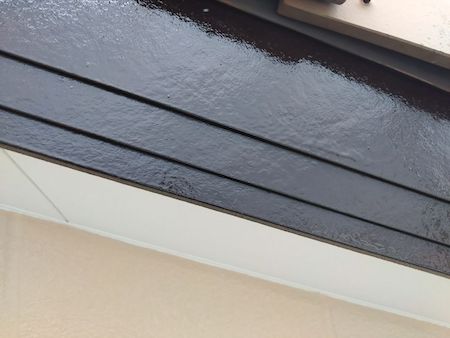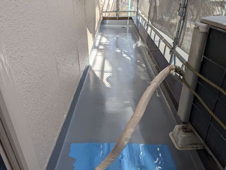最後に防水層の表面を保護するトップコートを全体に塗布します。トップコートを塗布した部分がグレーのところです。
