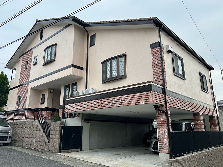 Y様邸におかれましては、レンガタイルの風合いをより美しく引き立つよう、淡く明るいベージュカラーで塗り替えました。タイルとのコントラストがはっきりしたことで、全体がグッと引き締まり、洗練された仕上がりになっています。