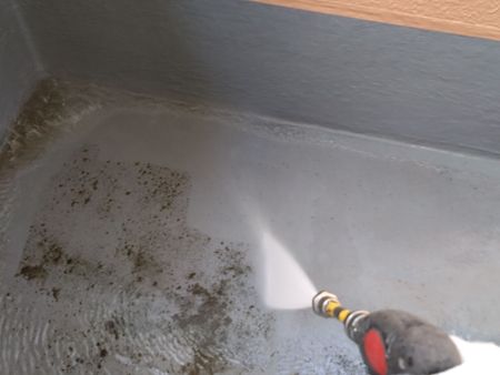 ベランダ床は、土ぼこりも溜まりやすく黒く汚れていることが多い場所です。すみずみまで念入りに高圧洗浄していきます。