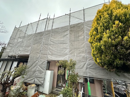 近隣挨拶を行って工事着工となります。足場を組み、洗浄水や塗料が飛散しないようにメッシュシートで建物全体を覆います。