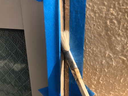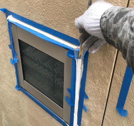 サッシまわりは、既存のシーリングの上に増し打ちする工法で施工します。プライマーを丁寧に塗っていきます。