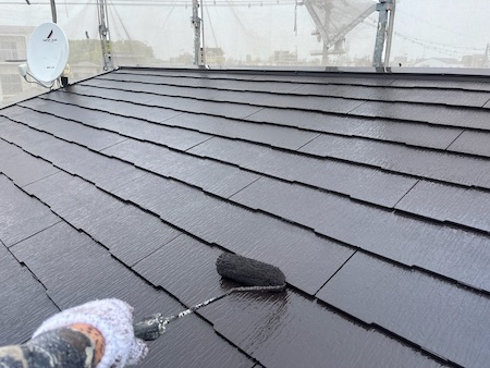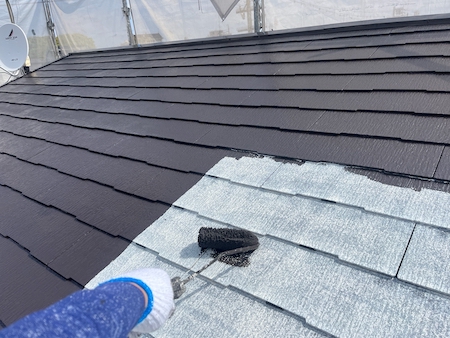 上塗りを塗り、適正値以上の塗膜の厚さを確保します。艶をなくし色あせていた屋根が見違えるような仕上がりですね。