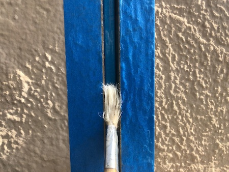 シーリングをきれいに仕上げるため外壁の目地に沿って養生テープを貼り、接着剤の役目を持つプライマーを塗布しています。