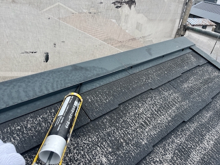 シーリングを充填し、厚さを均一にしながら整えます。厚みを確保し、雨水の浸入を防ぎ建物を守ります。