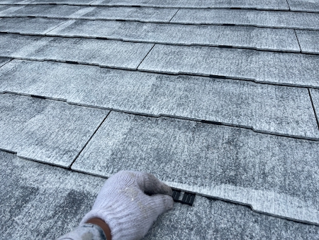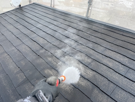 業務用の高圧洗浄機から水を噴射させ、その圧力によって屋根に付着している砂ぼこりや古い塗膜などの汚れを除去します。