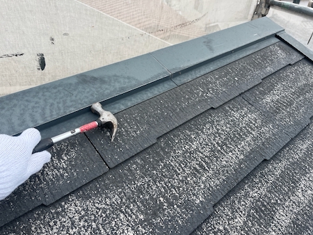釘のゆるみを打ち直します。固定不足の釘を放置すると板金が飛ばされたり、雨漏りの原因になったりします。