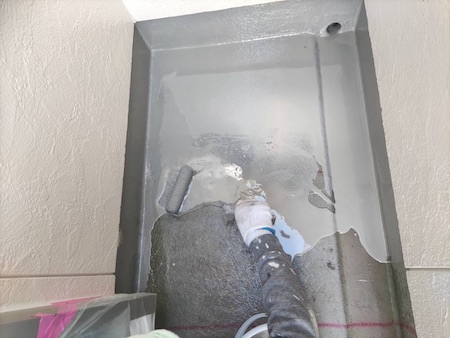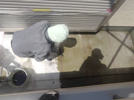 しっかりとした下地を整えることで、防水材が定着し防水効果が得られます。密着を良くするためのプライマーを塗布します。