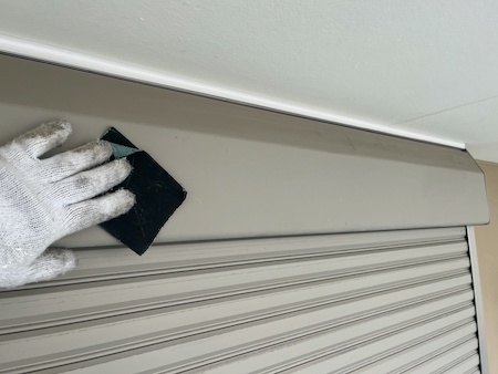 シャッターボックスの塗装前に塗料の密着がよくなるようケレン作業しています。