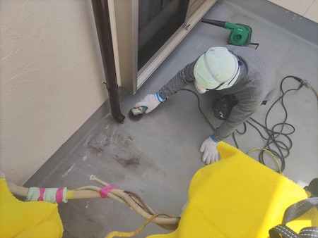 防水工事前のケレン補修と清掃作業です。電動工具を使って傷んでいる部分をはがし、下地調整しています。