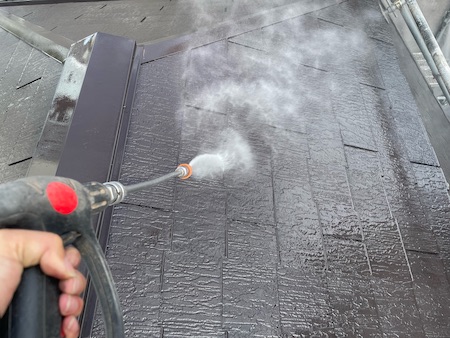 屋根の高圧洗浄です。高圧洗浄とは、業務用の高圧洗浄機を使用して付着している汚れや古い塗膜などを除去する作業です。