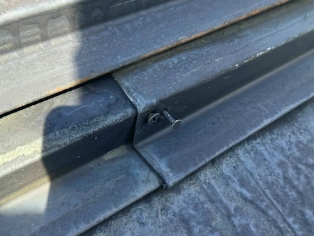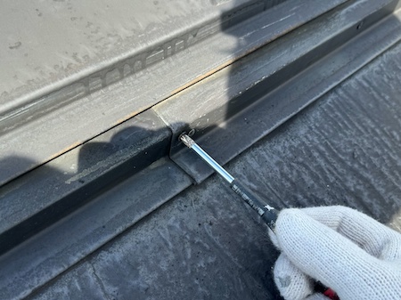 ビス(ネジ)のゆるみは締め直します。放置すると板金が飛ばされたり、雨漏りの原因になったりします。