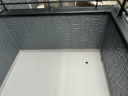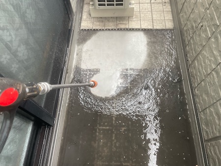 ベランダ床のルーフタイルを一旦取り外すと、土ぼこりが溜まっています。蓄積された汚れがどんどん洗い流されていきます。