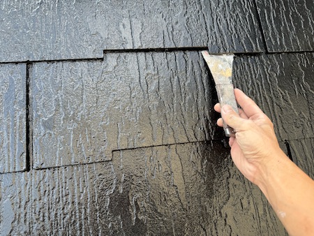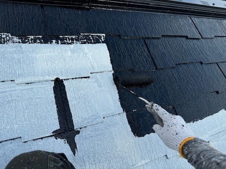 中塗りです。スレート屋根のジョイント部分が数センチ離れているため、先に刷毛(はけ)で塗装しています。