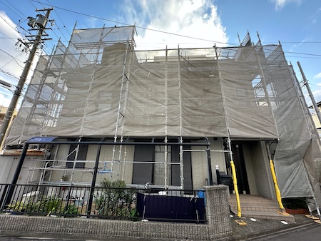 近隣挨拶を行って工事着工となります。足場を組み、洗浄水や塗料が飛散しないようメッシュシートで建物全体を覆います。
